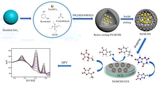 Firstly, the bare GCE was polished with 1 µm and 0.05 µm Al2O3 powders, followed by ultrasonic cleaning with 0.5 M H2SO4 and anhydrous ethanol, respectively. Subsequently, 1 mg Pd/MCHS was sonicated in a solution containing 0.5 mL distilled water, 0.5 mL anhydrous ethanol, and 6 µL Nafion for 10 min to prepare a homogeneous suspension. Then, the homogeneous suspension (6 µL, 1 mg/mL) was dropped on the pretreated GCE and dried using an infrared lamp to prepare the Pd/MCHS/GCE sensor. The preparation process of the Pd/MCHS/GCE sensor as well as the simultaneous detection of AA, DA, and UA using the fabricated sensor were illustrated in Scheme 1.