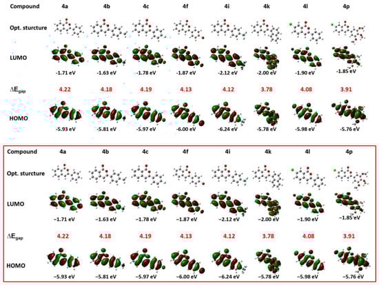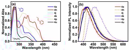 The isocoumarin derivatives exhibit very similar absorption spectra in THF (Figure 1a), with a maximum absorption peak (λa) of about around 280 nm and one or multiple bands in the range of 300–400 nm. The molar extinction coefficients (ε) of these absorption peaks are greater than 104 L·mol−1·cm−1, confirming that intramolecular electron transitions are permitted [41]. The absorption at shorter wavelengths mainly arises from π-π* transition absorption, while the absorption at longer wavelengths is primarily attributed to n-π* transition absorption and intramolecular charge transfer absorption generated by the donor–acceptor (D-A) system [42]. The long-wavelength, lower-energy band absorption is attributed to the transition of the dominant H (HOMO) → L (LUMO), while the maximum absorption peak is mainly attributed to the H → L+1 or H-2 → L+1 transition. The difference in absorption intensity is related to the various oscillator strengths (fosc). Like most molecules, derivatives 4 with larger conjugated structures have larger and broader UV absorption spectra, with 4h > 4a > 4u. Furthermore, fluorescence emission spectra were used to roughly assess the photoluminescence behavior of these compounds (Figure 1b). Their emission wavelengths are primarily concentrated around 420 nm, resulting in purple emission. Notably, the emission wavelength of 4p is 457 nm with blue fluorescence. Their Stokes shift values range from 3978 to 6678 cm−1. This value is comparable to that of most small-molecule fluorescent compounds at this stage [43]. This may facilitate the material’s ability to overcome self-absorption and be effectively applied to probes or imaging. Of course, subsequent studies can also prepare isocoumarin derivatives with larger Stokes shifts by molecular design (i.e., introducing electron-withdrawing groups, extending conjugated systems, etc.) [44]. In THF, the absolute fluorescence quantum yields of 4h can reach 14%, while 4u, with the smallest conjugated structure, exhibits a hardly detectable fluorescence quantum yield.