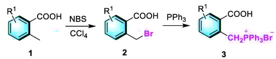 The readily accessible starting material (2-carboxybenzyl)triphenylphosphonium bromide 3 was synthesized as depicted in Scheme 2 [35]. In this process, the reaction between 2-methylbenzoic acid 1 and N-Bromosuccinimide (NBS) in CCl4 took place at reflux temperature over a duration of 4–8 h, yielding 2-(bromomethyl)benzoic acid 2 in 80% yield. Next, the 2-(bromomethyl)benzoic acid 2 reacted with triphenylphosphine in acetone at room temperature, producing (2-carboxybenzyl)triphenylphosphonium bromide 3 in 90% yield.