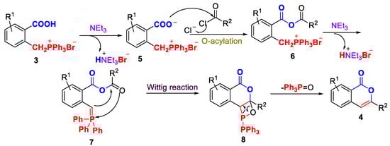 Based on the presented observation and previous literature reports [27,33,35], Scheme 3 depicts a plausible mechanism for the sequential O-acylation/Wittig process. In the presence of the base NEt3, phosphonium salt 3 is converted into conjugate base 5, which undergoes O-acylation with an acyl chloride to form an anhydride 6. This process releases one equivalent of HBr, which is captured by NEt3. Then, a second equivalent of triethylamine deprotonnates the anhydride 6 to phosphorus ylide 7. This process releases one equivalent of HBr, which is also captured by NEt3. Subsequently, phosphorus ylide 7 undergoes an intramolecular Wittig reaction to form oxaphosphetane intermediate 8, accompanied by [2+2] cycloaddition. Intermediate 8 then converts to 1H isochrom-1-one 4, releasing equimolar amounts of oxygen and phosphorus.