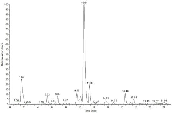 The LC–ESI/HRMSn analysis allowed us to assign compounds 10, 16, 21, 22, 3, 13, 7, and 14 as glycosides of isorhamnetin, quercetin, and kaempferol, respectively (Table 1). This assignment is in agreement with both mass spectrometric data from the literature and previous reports on Diplotaxis spp., highlighting compounds 3 and 7 as never described in D. harra [36,37,38,39,40,41,42].