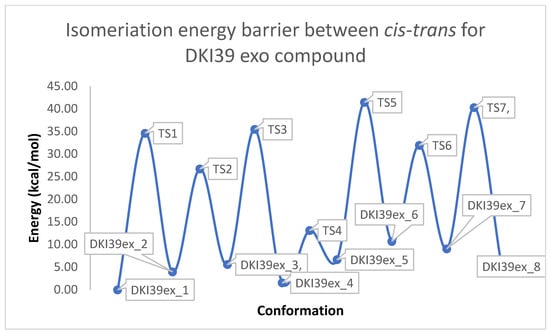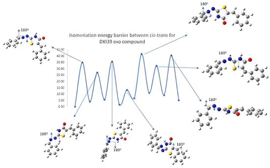 Schematic representation of cis-trans kinetic isomerization for DKI39 exo compound (y = energy in kcal/mol, x = conformation). In each transition state, the dihedral angle, which is rotated by ~180°, is shown by an arrow.