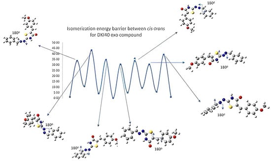 Schematic representation of cis-trans kinetic isomerization for DKI40 exo compound (y = Energy in kcal/mol, x = conformation). In each transition state, the dihedral angle, which is rotated by ~180°, is shown by arrow.