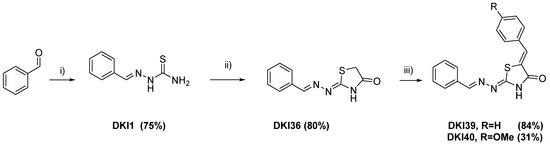 Reagents and conditions: (i) thiosemicarbazide, EtOH, cat. AcOH, 80 °C, 4 h; (ii) methyl 2-chloroacetate, MeOH, CH3COONa, 65 °C, 6 h; (iii) (a) benzaldehyde, MeOH, cat. Piperidine, 65 °C, 48 h (for DKI39) and (b) anisaldehyde cat. piperidine, rt, 7d (for DKI40).