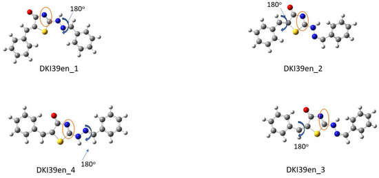 Optimized conformations derived from DFT calculations for the DKI39 endo compound. In the Figure the dihedral angles rotated by 180° are shown. For instance, in DKI39en_1, the dihedral angle τ1 was rotated and DKI39en_2 was obtained. In the orange circle, the double bond that indicates the endo nature of compound is shown.