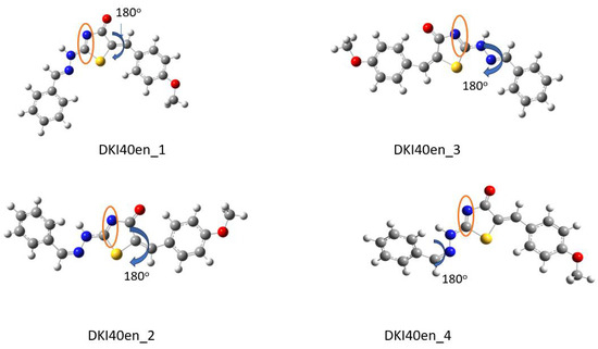 Optimized conformations derived from DFT calculations for the DKI40 endo compound. In the Figure, the dihedral angles rotated by 180° are shown. For instance, in DKI40en_1, the dihedral angle τ3′ was rotated and DKI39en_2 was obtained. In the orange circle, the double bond that indicates the endo nature of compound is shown.