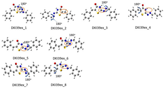The conformations DKI39ex_1 and DKI40ex_1 were the initial optimized structures. Then, by rotating the dihedral angles by 180°, additional conformations were obtained, which subsequently were geometry-optimized. For example, from DKI39ex_1 to DKI39ex_2, τ1 dihedral angle was rotated by 180° approximately. Considering the exo compounds, the conformations that occurred for DKI39 and DKI40 are shown in Scheme 6 and Scheme 7. The double bond, which is considered as exo for both compounds, is shown in a orange circle and it is the same for the eight different conformations. The relative energies are given in Table 3 for the exo isomorph, as well as the values of dihedral angles for both compounds. In the next section, the transition states are presented.