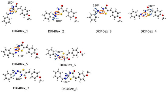 Optimized conformations derived from DFT calculations for the DKI40 exo compound. In the Figure, the dihedral angles rotated by 180° are shown. For instance, in DKI40ex_1, the dihedral angle τ2′ was rotated and DKI40ex_2 was obtained. In the orange circle the double bond that indicates the exo nature of compound is shown.