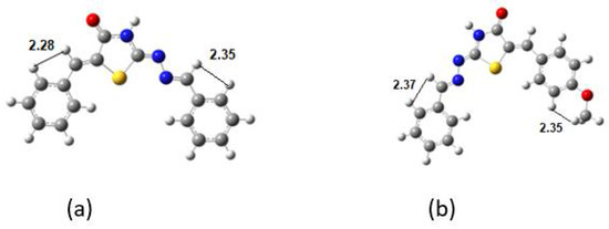 Because the BBB [24] value (Table 7) is less than one, both compounds are inactive in the central nervous system (CNS). The value for human intestinal absorption is high for both compounds, and this signifies that these compounds might be better absorbed from the intestinal tract on oral administration. Both compounds are not inhibitors of CP isoenzymes and, therefore, are not toxic or do not exert other unwanted adverse effects.