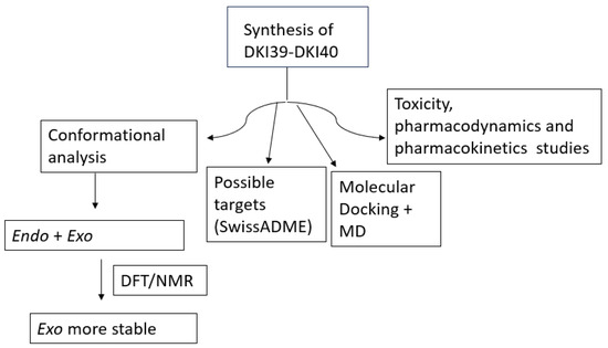 The dihedral angles of the minima were expected to be about 180° and 0°, however, there are deviations from these values due to stereochemical hindrances within the structures. The lowest energy conformations for DKI39 and DKI40 exo compounds are DKI39ex_1 and DKI40ex_1, respectively. To sum up, the DFT calculations show that the exo isomer is lower in energy than the endo one for both molecules. Specifically, among the exo calculated conformations, the DKI39ex_1 and DKI40ex_1 are the energetically more favorable isomers of the DKI39 and DKI40 compounds (Scheme 8). In particular, the endo conformer is higher than exo by 3 kcal/mol approximately. This was also confirmed because no spatial relationship was observed in 2D-NOESY between the NH group with the H-5 in both molecules (Figure 1). Also, in the exo conformers, there is an extended resonance which cannot be applied on the higher energy endo conformer. In Table 4, selected distances of the most energetical favorable conformations which have also been observed in 2D-NOESY are shown (Figure 1).