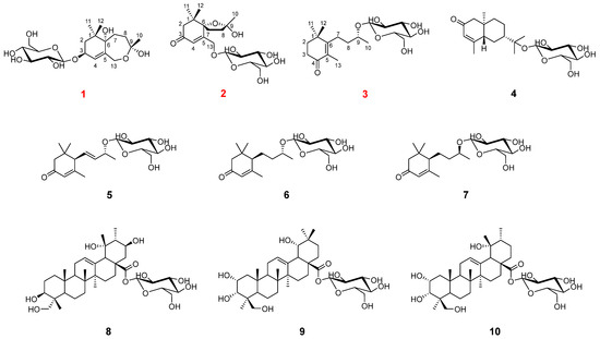 The seven known compounds (4–10) isolated from R. capitatum were shown to be (5R,7R,10S)-isopterocarpolone β-D-glucopyranoside (4) [18], (6R,9R)-3-oxo-α-ionol β-D-glucopyranoside (5) [19], (6R,9R)-3-oxo-α-ionol glucosides (6) [19], (6R,9S)-3-oxo-α-ionol glucosides (7) [20], incarvilloside A (8) [21], incarvilloside B (9) [21], and 2α,3α,19α,24-tetrahydroxyurs-12-en-28-oic acid β-D-glucopyranosyl ester (10) [22].