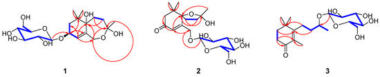Compound 1 was obtained as colourless gum, and its molecular formula was established as C19H32O9 from its HRESIMS data (m/z 373.1937 [M + Na]+, calcd for C19H32O9Na, 427.1939). The 1H NMR spectrum of 1 (Table 1) displayed the signals of an olefinic proton at δH 5.77 (1H, br s, H-4), two oxygenated methylene protons at δH 4.48 (1H, d, J = 12.3 Hz, H-13a) and 4.02 (1H, d, J = 12.3 Hz, H-13b), an oxygenated methine proton at δH 4.36 (1H, dd, J = 6.4, 4.7 Hz, H-3), and three methyl groups at δH 1.39 (3H, s, H3-10), 0.99 (3H, s, H3-11), and 0.96 (3H, s, H3-12). The corresponding 13C NMR data (Table 1) showed 19 carbon signals, including one double bond pair at δC 124.8 (C-4) and 137.3 (C-5); four oxygenated carbons at δC 73.9 (C-3), 85.4 (C-6), 108.3 (C-9), and 66.7 (C-13); one quaternary carbon at δC 35.8 (C-1); three methylenes at δC 41.8 (C-2), 29.8 (C-7), and 35.7 (C-8); three methyls at δC 24.3 (C-10), 23.5 (C-11), and 24.1 (C-12); along with a β-glucose at δC 103.5 (C-1′), 75.1 (C-2′), 78.0 (C-3′), 71.6 (C-4′), 77.9 (C-5′), and 62.8 (C-6′). The sugar moiety was determined as D-glucose by LC-MS analyses after acid hydrolysis and derivatization. The 1H-1H COSY correlations (Figure 2) including H2-2/H-3/H-4 and H2-7/H2-8 led to the establishment of two coupled proton groups. The HMBC correlations (Figure 2) from H-4 to C-2/C-6/C-13, from H2-13 to C-4/C-6/C-9, from H2-7 to C-9, from H2-8 to C-6, and from H3-10 to C-8/C-13, combined with the degree of unsaturation, indicated that 1 was a bicyclic ionone glycoside and similar to 7,8-dihydro-3β,6α-dihydroxy-α-ionone 9-O-β-D-glucopyranoside [13], except the sugar was located at C-3 instead of C-9, and a hemiacetal structure was formed between C-9 and C-13. Those changes were verified via HMBC relationships (Figure 2) of H-1′/C-3, H2-13/C-9, and H3-10/C-13, respectively. Meanwhile, 1 was a novel ionone with a 6/7 bicyclic skeleton. In the NOESY spectrum (Figure 3), the correlations between H3-11 and H-3 indicated that OH-3 and H3-12 are located at the same side and regarded as β-oriented; the correlations between H3-12 and H2-7/H3-10 indicated that H2-7 and H3-10 are also β-oriented. So, the most probable configuration of 1 is either 3S, 6S, 9R or 3R, 6R, 9S. The absolute configurations at the stereogenic centres of 1 were determined to be 3S, 6S, 9R by comparison of the experimental ECD curve and calculated electronic circular dichroism (ECD) data at the B3LYP/6-311G(d,p) level in MeOH (Figure 4). Therefore, compound 1 was determined as shown in Figure 1, and named as capitsesqside A.