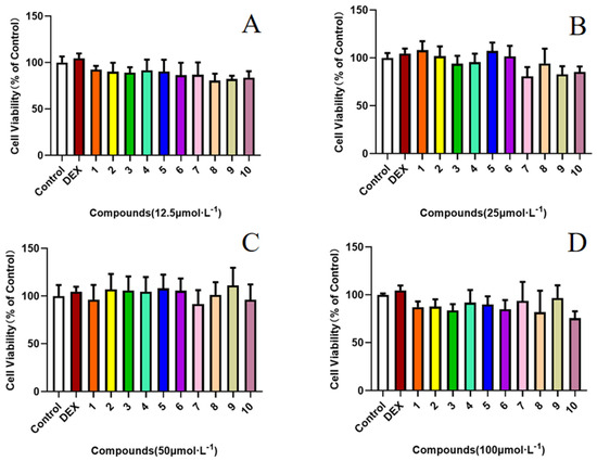 Effects of compounds 1–10 on cell viability ((A): 12.5 μM, (B): 25 μM, (C): 50 μM, and (D): 100 μM). The concentrations of these compounds ranged from 12.5 to 100 μM. Analysis of cell viability was by GraphPad Prism (8.0.2), and data are expressed as the mean ± SD. Three independent experiments were performed. Dexamethasone (DEX) was used as a positive control.
