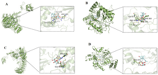 (A): The molecular interactions of compound 2 with NLRP3 by molecular docking simulation. (B): The molecular interactions of compound 2 with iNOS by molecular docking simulation. (C): The molecular interactions of compound 5 with NLRP3 by molecular docking simulation. (D): The molecular interactions of compound 5 with iNOS by molecular docking simulation.