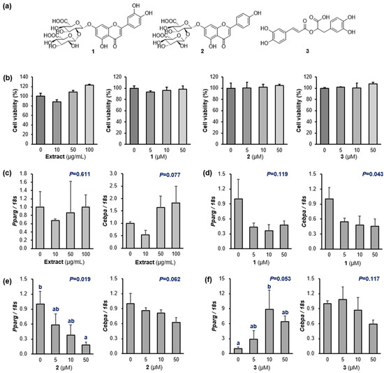 (a) Structures of luteolin-7-O-diglucuronide (1), apigenin-7-O-diglucuronide (2), and rosmarinic acid (3). (b) Cell viability of the P. frutescens var. acuta water extract (PFW) and 1–3 against a 3T3-L1 cell line. (c) Inhibitory effect against the preadipocyte differentiation of PFW (0, 10, 50, and 100 μg/mL). (d–f) Inhibition of preadipocyte differentiation by 1–3 (0, 5, 10, and 50 μM). 3T3-L1 preadipocytes were treated with each component dissolved in DMSO during differentiation. The mRNA levels were determined by quantitative real-time polymerase chain reaction (RT-PCR) with normalization relative to 18s rRNA. Data are presented as means ± standard error of mean (n = 3). Different letters (a and b) indicate significant differences at p < 0.05 by Duncan’s multiple comparison test. Pparg, peroxisome proliferator-activated receptor gamma; Cebpa, CCAAT/enhancer-binding protein α; P, p-value.