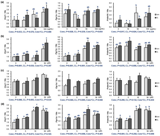 Thermogenetic induction of (a) the PFW extract (0, 10, 50, and 100 μg/mL) and (b–d) 1–3 (0, 5, 10, and 50 μM) on 3T3-L1 adipocytes. The compounds were identified as luteolin-7-O-diglucuronide (1), apigenin-7-O-diglucuronide (2), and rosmarinic acid (3). Fully differentiated 3T3-L1 preadipocytes were treated with each component dissolved in DMSO for 24 h with a 4 h treatment of CL316,243 (CL; 10 μM). The mRNA levels were determined by quantitative RT-PCR with normalization relative to 18s rRNA. Data are presented as means ± standard error of mean (n = 3). A two-way ANOVA was conducted to determine the effects of the concentration of the PFW extract and 1–3 (Conc), CL treatment (CL), and the interaction of Conc and CL (Conc*CL). Different letters (a, b and c) indicate significant differences at p < 0.05 by Duncan’s multiple comparison test. Ucp1, uncoupling protein 1; Pgc1a, peroxisome proliferator-activated receptor gamma coactivator 1-α; Prdm16, PR domain-containing 16; P, p-value.