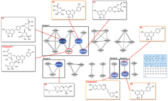 Feature-based molecular networking (FBMN) of the PFW extract. A total of 34 single nodes and 10 clusters (nodes ≥ 2) were found in the network, and a total of seven compounds (3 and P1–P6) were identified using the FBMN analysis. Compounds in the orange boxes (3, P2, P5, and P6) indicate the components that were simultaneously identified by the FBMN and Progenesis QI (ProQI) analyses. Although the node “637.104” in Cluster 1 was not identified in the FBMN analysis, it was assigned to compound 1 (luteolin-7-O-diglucuronide/luteolin-7-O-[β-D-glucuronosyl-(1→2)-β-D-glucuronide]) by the ProQI software ver. 3.0.