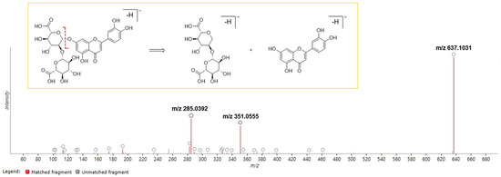 Example of the component prediction of the extract using ProQI. Compound 1 was identified as luteolin-7-O-diglucuronide by analyzing the fragmentation patterns of the peak “m/z 637.1031”. This peak was divided into two substructures: a flavonoid (m/z 285.0392) and a diglucuronide (m/z 351.0555).