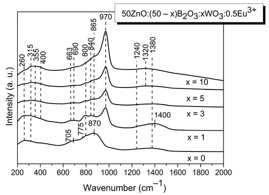 In the present study, we have used, additionally, Raman spectroscopy in order to obtain more complete structural information about the investigated glasses. The Raman spectra obtained are shown in Figure 2. The Raman spectrum of the base zinc borate glass, without WO3 (Figure 2; x = 0), is in good agreement with what has been reported by other authors for similar compositions [21,22,23]. It contains a strong and broad band centered at about 870 cm−1, bands at 800 cm−1 and 775 cm−1, a broad shoulder at about 705 cm−1, features at about 260 cm−1 and 315 cm−1 and a high-frequency envelope from about 1200 to 1550 cm−1.