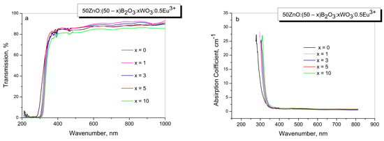 Figure 3a,b presents the optical transmission spectra and absorption coefficient data of the investigated glasses. As is seen from Figure 3a, glasses are characterized as having good transmission in the visible region of the electromagnetic spectrum at around 80%; this slightly decreases with the WO3 loading. The changes in the optical transmission observed are due to the low coloration of the glasses containing WO3. In addition, the absence of any absorption bands in the visible range indicates that there are no tungstate ions in the lower-than-W+6 valance state, since the reduced W+5 and W+4 ions produce very intensive absorption bands in the visible range due to d-d transition [25].