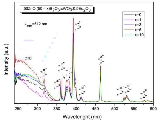 The optical properties of the obtained glasses were further studied. The excitation spectra of 50ZnO:(50 − x)B2O3:xWO3:0.5Eu2O3 (x = 0, 1, 3, 5 and 10) glasses, shown in Figure 4, are recorded at room temperature, monitoring the most prominent Eu3+ emission at 612 nm (5D0 → 7F2 transition). The spectra consist of two distinct parts. The first part is composed of a broad band in the spectral range from 250 nm to 350 nm due to the ligand-to-metal charge transfer transitions (LMCT) of O2− → W6+ [26] and O2− → Zn2+ [27] inside the WOn (WOn = WO4 and WO6) and ZnOn (ZnOn = ZnO4) host absorbing groups, respectively, and from the oxygen 2p orbital to the empty 4f orbital of europium (O2−→ Eu3+) [28,29,30,31]. Additionally, several sharp intra-configurational 4f → 4f transitions of Eu3+ can be observed in the spectra at 317 nm, 375 nm, 380 nm, 392 nm, 413 nm, 463 nm, 524 nm, 531 nm and 576 nm due to 7F0 → 5H3, 7F0 → 5D4, 7F0 → 5G2, 7F1 → 5L7, 7F0 → 5L6, 7F0 → 5D3, 7F0 → 5D2, 7F0 → 5D1, 7F1 → 5D1, 7F0 → 5D0, respectively [32]. The 7F0 → 5H3 excitation peak at 317 nm is superposed over the broad charge transfer band. The strongest excitation lines are observed at 392 nm and 463 nm, assigned to the 7F0 → 5L6 and 7F0 → 5D2 transitions in the near-UV and visible blue regions. These wavelengths are suitable for excitation with commercial near-ultraviolet light-emitting diodes (LEDs) (250–400 nm) and blue LED chips (430–470 nm).