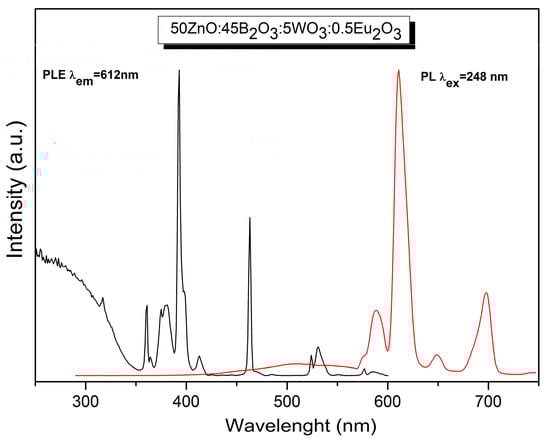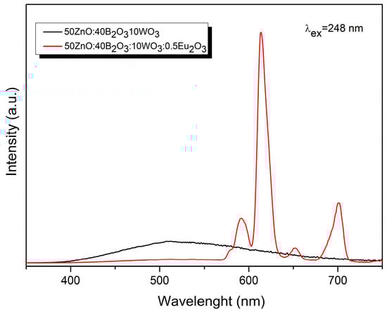 In Figure 6, it can be seen the emission spectra of pure and Eu3+-doped 50ZnO:40B2O3:10WO3 glass matrix were acquired upon excitation at the maximum value of the host charge transfer band at 248 nm (WOn and ZnOn absorbing groups). The observed decrease in the emission of the host absorbing groups in Eu3+-doped glass (red line), as compared to pure host emission (black line) [27,39], evidences that energy transfer has occurred. In other words, the energy absorbed by tungstate and zincate groups is further transferred non-radiatively to the active Eu3+ ion. The results obtained above also imply that Eu3+ and the WOn and ZnOn groups are closely coordinated in the structure [33]. It is known that the probability of energy transfer increases when the host absorbing groups, in our case WOn or ZnOn and the Eu3+ active ion, are nearest neighbors in the structure [40]. The emission spectra of Eu3+-doped glasses are also obtained by monitoring the 7F0 → 5L6 transition at 392 nm (Figure 7).