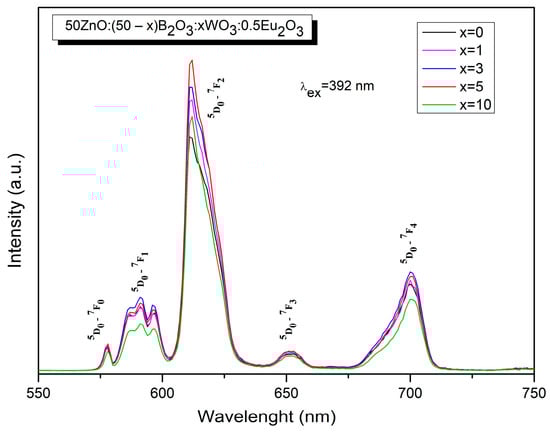 PL emission spectra of glasses 50ZnO:(50 − x)B2O3:xWO3:0.5Eu2O3 (x = 0, 1, 3, 5 and 10).