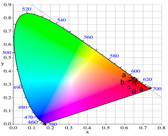 CIE chromaticity diagram of the 50ZnO:(50 − x)B2O3:xWO3:0.5Eu2O3 (a) x = 0, (b) x = 1, (c) x = 3, (d) x = 5, (e) x = 10 glasses.