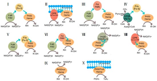 The P450s can be divided into ten categories [25,26], as shown in Figure 1, according to the redox-partner protein required by P450s in the catalytic reaction process. Classes I commonly found in bacteria and mitochondria consist of a P450 enzyme, a ferredoxin reductase redox-partner (FdR; cofactor flavin adenine dinucleotide (FAD)), and a small iron-sulfur protein-containing ferredoxin (Fdx). Classes II, present in eukaryotes, consist of a P450 enzyme and a membrane-bound cytochrome P450 reductase (CPR) as redox-partner, containing both FAD and flavin mononucleotide (FMN). Classes III: found in bacteria, the Fdx is replaced by a flavodoxin (Fld) containing FMN. Classes IV were first discovered in Sulfolobus solfataricus, where the FdR is replaced by 2-oxo-acid-ferredoxin oxidoreductase (OFOR). Classes V, first discovered in Methylococcus capsulatus, are fused with their redox-partners, Fdx. Classes VI, first discovered in Rhodococcus rhodochrous, are fused with their redox-partners, Fld. Class VII, first discovered in Rhodococcus, consists of an N-terminal P450 heme domain and a C-terminal reductase domain, consisting of an FMN-binding domain, an NADH-binding domain, and a [2Fe-2S] ferredoxin domain. Class VIII enzymes, first discovered in Bacillus megaterium, are self-sufficient enzymes, that contain binding sites for heme fused with CRP through a linker. Class IX is the only water-soluble eukaryotic P450 enzyme and can directly use NAD(P)H as an electron donor. Class X is independent of oxygen, NAD(P)H, and CRP however, uses acyl hydroperoxides as both substrate and oxygen donor.