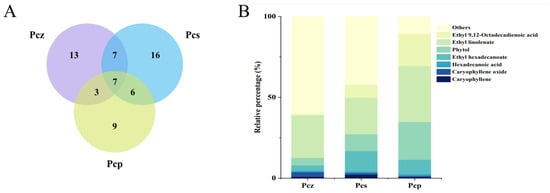 A Venn diagram (Figure 1A) displaying the overlapping compounds is used to visualize the relationships between the components in the three datasets. There were seven compounds that were shared by the three PEEs. These were β-caryophyllene, caryophyllene oxide, hexadecanoic acid, ethyl hexadecanoate, phytol, ethyl linolenate, and ethyl 9,12-octadecadienoic acid (Figure 1B). These compounds were distributed in different proportions in all PEEs and decreased in the following order: Pcp > Pcs > Pcz. Based on the plant material and component analysis results, natural environment and artificial cultivation play important roles in PEE components. It was found that the differences in chemical composition among the three groups were noticeable at the genus level, and it can be seen that Pcz has 13 unique ingredients, Pcs has 17, and Pcp has 9.