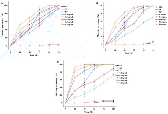 Molluscicidal activity of Pcs (A), Pcz (B), and Pcp (C) against P. canaliculata. Significance between the mean of each group is compared at the p < 0.05 level (n = 3).