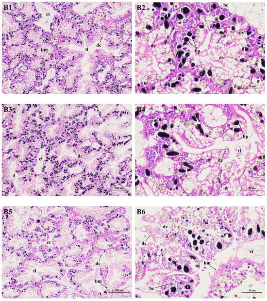 Light micrograph of the hepatopancreas of P. canaliculata stained with hematoxylin and eosin staining (HE). B1 (×100) and B2 (×400) are the blank control; B3 (×100) and B4 (×400) are the negative control; B5 (×100) and B6 (×400) are the treated group. bc: basophilic cell; dc: digestive cell; dv: digestive vacuole; bp: black particle; bm: basal membrane; ct: connective tissue; tl: tubule lumen.