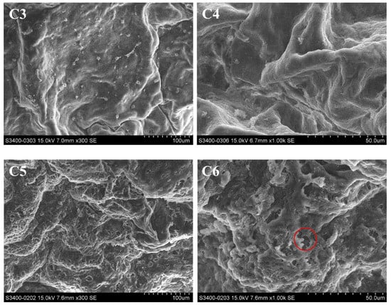 The surface structure of the hepatopancreas was observed by scanning electron microscopy (SEM), and changes were recorded (Figure 5). In the control groups, there were folds and circular pores on the surface of the hepatopancreas and the pores were surrounded by fine filaments of connective tissue (Figure 5(C1–C4)). After exposure to Pcp (0.27 mg/mL) for 48 h, the hepatopancreas surface had erosive damage and the fine filaments of connective tissue disappeared. As the red circle shows, clear evidence of damage to the surface was visible.