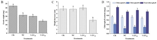 Effect of Pcp addition (A) on biomass production (B), growth in the shoots (C), and relative chlorophyll content in the rice leaves of rice plants (D) (n = 6) after 5 days of treatment. Bars marked with the same letter for each group do not differ significantly according to the Waller–Duncan test at p < 0.05.