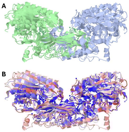 Crystal structure of human carnosine dipeptidase 1 (PDB id: 3dlj) overlapped with the crystal structure of human carnosine dipeptidase 2 (PDB id: 4ruh). (A) reports the two monomers with separate colors; (B) reports carnosine dipeptidase 1 in red and carnosine dipeptidase 2 in blue.