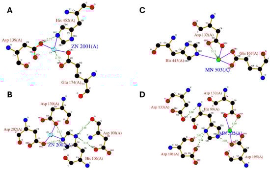 LIGPLOT diagram of main zinc interactions with human carnosine dipeptidase 1 (A,B) as from enzyme crystal structure (PDB id: 3dlj) and LIGPLOT diagram of main manganese interactions with human carnosine dipeptidase 2 (C,D) as from enzyme crystal structure (PDB id: 4ruh).