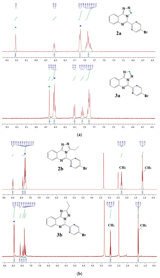 (a) 1H NMR spectra of 2a and 3a in DMSO-d6. (b) 1H NMR spectra of 2b and 3b in DMSO-d6. Hydrogen chemical shifts (δ) in ppm.