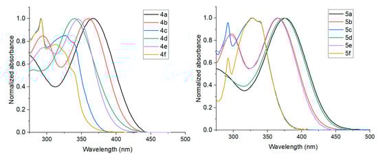 Normalized absorption spectra of compounds 4a–f (left) and 5a–f (right) in MeCN.