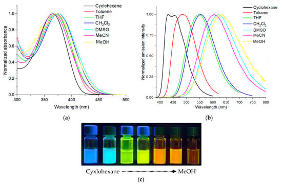 Absorption (a) and emission (b) spectra of compounds 4a in different solvents: cyclohexane, toluene, THF, DCM, DMSO, MeCN and MeOH; (c) photograph of solutions of 4a taken in the dark upon irradiation with a hand-held UV lamp (λem = 366 nm).