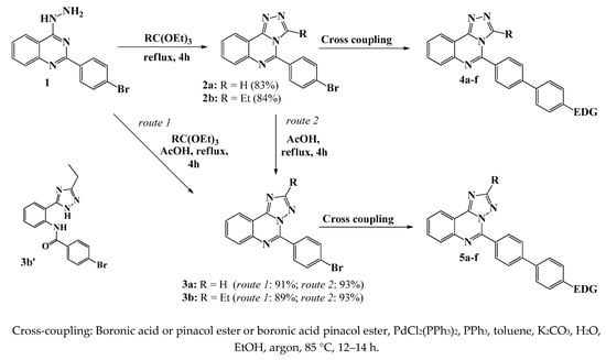 The synthetic approach (Scheme 1) is based on the use of previously described 2-(4-bromophenyl)-4-hydrazino-quinazoline 1 [33] as starting material. [1,2,4]Triazolo[4,3-c]quinazolines 2a,b were prepared by solvent-free cyclocondensation of 1 with triethyl orthoformate or triethyl orthopropionate under reflux for 4 h in good yields of 83 and 84%, respectively. A similar procedure was described previously for related compounds [34]. It was shown that the refluxing of staring hydrazine 1 with orthoesters in anhydrous ethanol gives triazolo[4,3-c]quinazolines 2a,b, with comparable yields. However, using 95% ethanol as a solvent resulted in the mixture of isomers 2 and 3 and the ring-opening product 3b′. The compounds 2a,b were successfully converted into triazolo[1,5-c]quinazoline isomers 3a,b by refluxing in glacial acetic acid for 4 h. The reaction progress can be easily monitored by TLC analysis. The Rf values of isomers are significantly different (for example, 0.16 for 2a and 0.71 for 3a in a 1/1 mixture of hexane/EtOAc).
