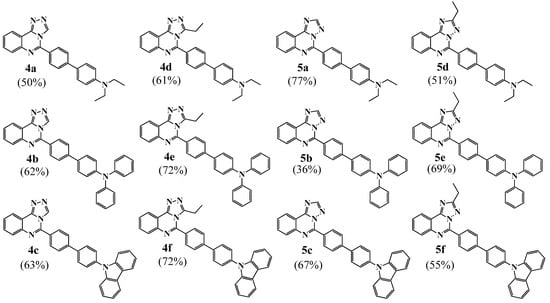 All the compounds of 4 and 5 are emissive in both solvents with different fluorescence intensity and quantum yield. The emission maxima of Et2N- and Ph2N-substituted triazoloquinazolines are in the range of 465–486 nm in toluene, whereas carbazolyl-containing triazoloquinazolines emit in the blue–purple region with maxima at 420–441 nm. The influence of the arrangement of the triazole core, as well as the presence of the Et-group, is negligible, Figure S20. However, all fluorophores are found to be sensitive in response to the polarity of the solvent. When going from toluene to MeCN, the emission band shifts to the red region and the maxima appear at 530–548 nm in the case of carbazolyl-derivatives 4c, 4f, 5c, and 5f, and in the range of 593–609 nm for other counterparts, 4a,b,d,e and 5a,b,d,e. According to the obtained quantum yields in the two solvents, compounds can be divided into several groups, namely: compounds 5d and 5f with ΦF ≥ 90% in both solvents; compounds 4a, 4b, 5a, 5b, and 5e with ΦF ≥ 90% in toluene (non-polar media); compounds 4c, 4d, 4e, and 5c with moderate ΦF (11–75%, depending on solvent); and compound 4f with low emission, less 3%. Moreover, the compounds 4a, 4b, and 5a–f demonstrate a decrease in quantum yield when going from non-polar toluene to polar MeCN whereas the compounds 4c, 4d, 4e, and 4f show enhancement emission in polar media compared to a non-polar one.