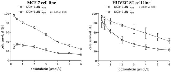 Doxorubicin showed similar cytotoxicity towards MCF-7 and HUVEC-ST cells. The drug caused a statistically significant decrease in the survival of cancer cells at concentrations ≥ 1 µmol/L and of endothelial cells at concentrations ≥ 0.5 µmol/L (Figure 2, left panel).