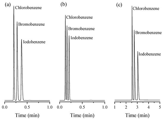 Separation of monohalobenzenes on UiO-66 PLOT at He flow rate of 3 mL/min with split injections at different temperature modes: (a) isothermal analysis at 200 °C, (b) isothermal analysis at 220 °C, (c) temperature program (60–180 °C, 50°/min).
