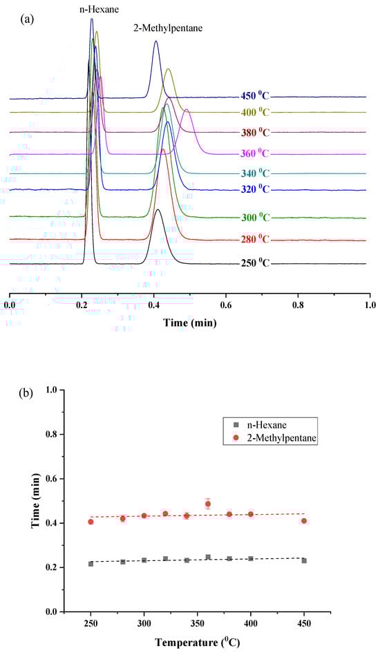 For the determination of the maximum operating temperature of the prepared UiO-66 PLOT columns, the column was heated for one hour at several temperatures in the range of 250–450 °C using the GC-FID system. After each heating cycle, a mixture of hexane and 2-methylpentane isomers was analyzed isothermally at 150 °C (Figure 7a).