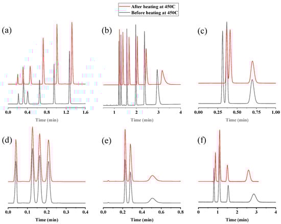 Comparison of separation performance of UiO-66 PLOT column before and after heating at 450 °C in terms of retention times of the analytes.