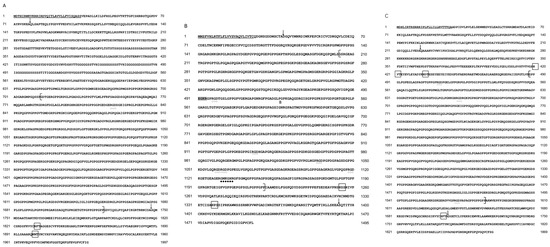 The deduced amino acid sequences of shortbill spearfish Tacol5a1 (A), Tacol5a2 (B), and Tacol5a3 procollagens (C). A single underlined letter indicates the cleavage site of the putative signal peptide, arrows indicate cleavage sites of N-propeptides and C-propeptides, and the putative intermolecular cross-linking sites are marked by black closed circles. The RGD sites that represent the potential cell adhesion sites are marked by open circles, Asn-X-Thr/Ser indicates glycosylation sites are boxed, and a shadow indicates the amidation site.