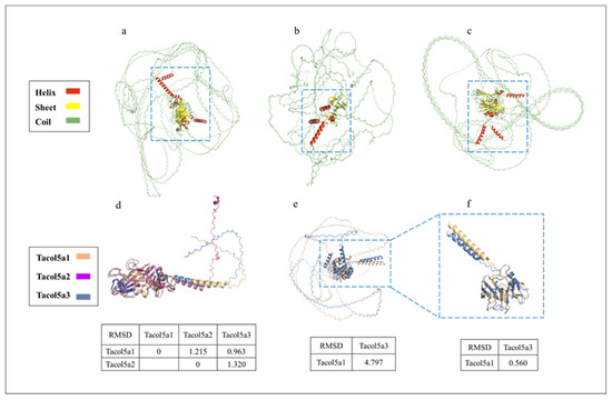 Tertiary structure prediction of shortbill spearfish Tacol5a1, Tacol5a2, and Tacol5a3 procollagens. Tertiary structure prediction of Tacol5a1, Tacol5a2, and Tacol5a3 procollagens are shown in panels (a–c); the C-terminus and N-terminus without triple-helix structures are boxed; (d) indicates an alignment of the tertiary structure of the C-terminus; (e) denotes an alignment of the tertiary structure of Tacol5a1 and Tacol5a2 procollagens without triple-helix structural domains; (f) denotes an alignment of the structure of the N-terminus without telopeptide.