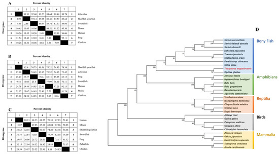 The homology of shortbill spearfish Tacol5a1 (A), Tacol5a2 (B), and Tacol5a3 (C) procollagens with other procollagens and their phylogenetic relationship (D). (D) is a maximum likelihood (ML) tree based on the amino acid sequences of procollagens. The other amino acid sequences were downloaded from the NCBI protein database. The phylogenetic tree was constructed by joining amino acid sequences of various species. Numbers at nodes indicate bootstrap values for 1000 replicates.