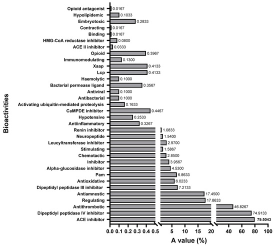 All the bioactivities in the database were selected to evaluate the feasibility of the three shortbill spearfish type V procollagens all together as a precursor for bioactive peptides by comparing the A values [45]. The A value denotes the frequency of occurrence of the bioactive fragments in collagen. A higher A value represents the higher potential of the protein to produce bioactive fragments. The frequency of occurrence for bioactive fragments in each bioactive type is shown in Figure 8. It is evident from this figure that fragments with dipeptidyl peptidase IV inhibition activity (74.91%), ACE inhibitory activity (75.90%), and thrombin inhibitory activity (46.83%) dominate the sequences of all type V procollagens. This suggests a significant presence of these activities within the collagen sequence. The BIOPEP-UWM database contains 48 major types of peptide bioactivities, of which 34 subclasses of peptide bioactivities could be identified in the obtained type V collagen amino acid sequence, indicating that type V collagen is a valuable potential candidate for the production of bioactive peptides.