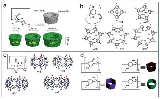 (a) Functional structural illustration of α-CD (n = 6), β-CD (n = 7), and γ-CD (n = 8). Bottom: the cavity structures with differential diameters’ corresponding CDs. Reprinted with permission from [60]. Copyright American Chemical Society, 2014. (b) Molecular structures of calix[n]arenes, n = 4–8. Reprinted with permission from [62]. Copyright Springer, 2005. (c) Molecular structures and X-ray crystal structures of cucurbit[n]urils, n = 5–8 [63,64]. Reprinted with permission from [62,63]. Copyright American Chemical Society, 2000 and 2003. (d) Chemical structures and schematic representations of pillar[n]arene, n = 5–7. Reprinted with permission from [65]. Copyright Wiley, 2013.
